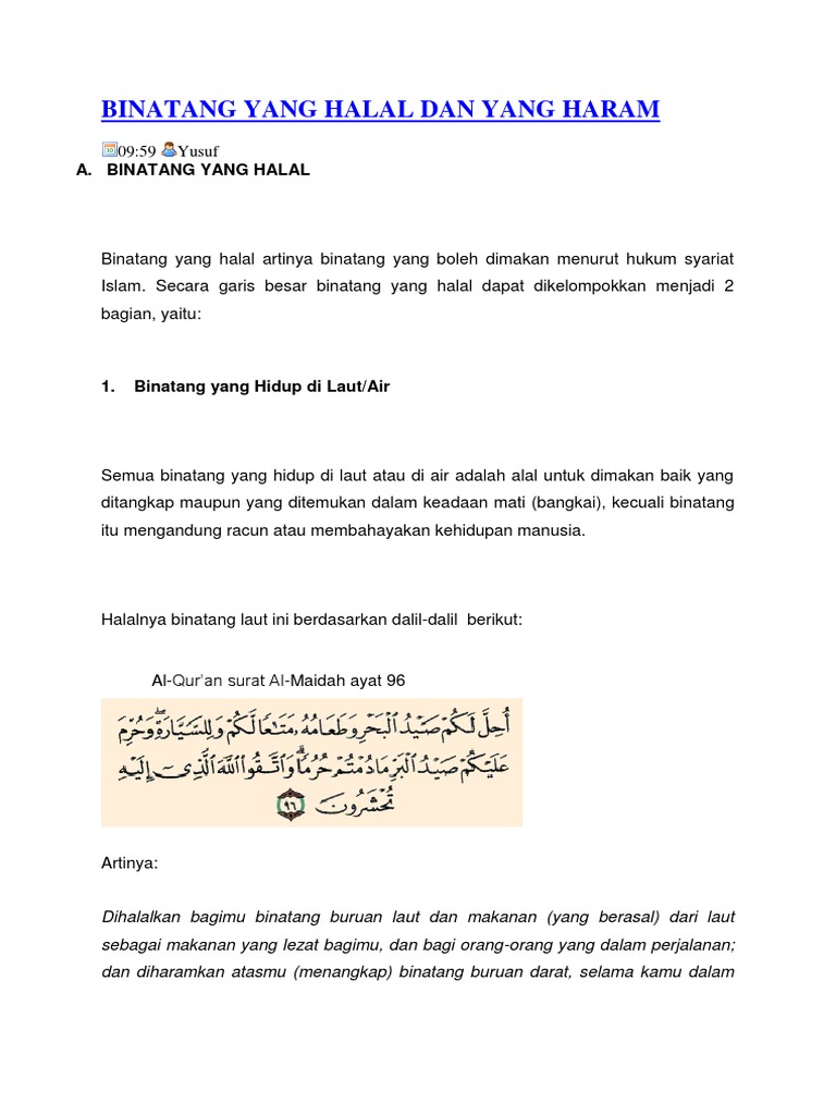 3 binatang yang diperintah dibunuh di tanah Haram seperti gagak rajawali. Katakanlah Tiadalah aku peroleh dalam wahyu yang diwahyukan kepadaku sesuatu yang diharamkan bagi orang yang hendak memakannya kecuali kalau makanan itu bangkai atau darah yang mengalir atau daging babi karena sesungguhnya semua itu kotor atau binatang yang disembelih atas nama selain Allah QS. Hal ini sesuai dengan sabda Nabi Muhammad SAW yang di riwayatkan oleh Muslim dari Abu Hurairah radhiyallahu anhu yang artinya Seluruh binatang pemangsa dengan gigi taringnya maka haram memakannya.